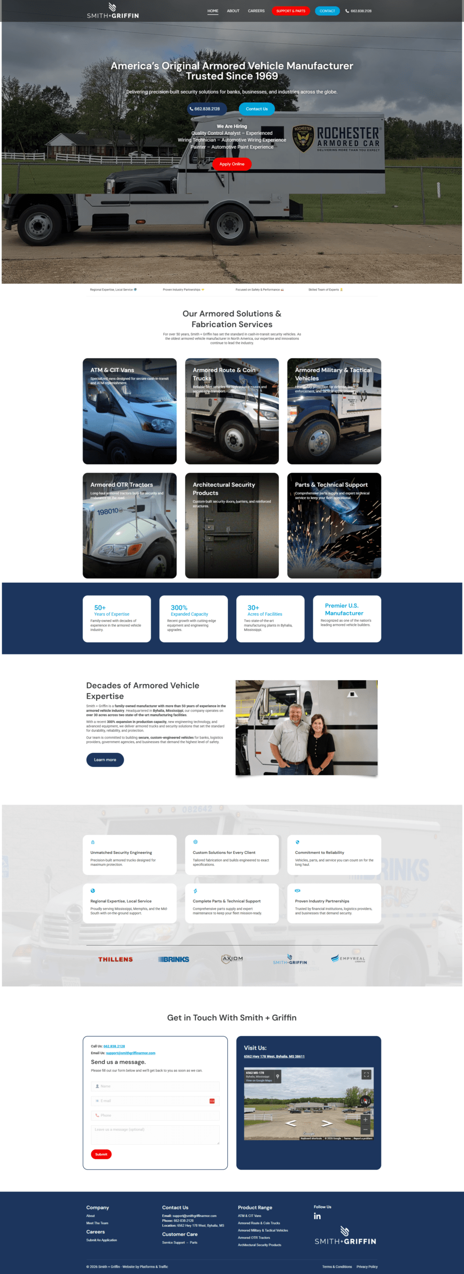 Smith + Griffin, a legacy name in armored transport and physical security, needed a digital presence that matched its reputation for durability, scale, and trust. Despite a broad manufacturing portfolio and expanded capabilities, the company lacked a cohesive online platform to showcase its vertically integrated operations to high-security clients.